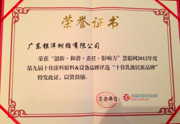 慧聰網12年度第九屆十佳涂料&設備品牌評選“十佳乳液民族品牌”