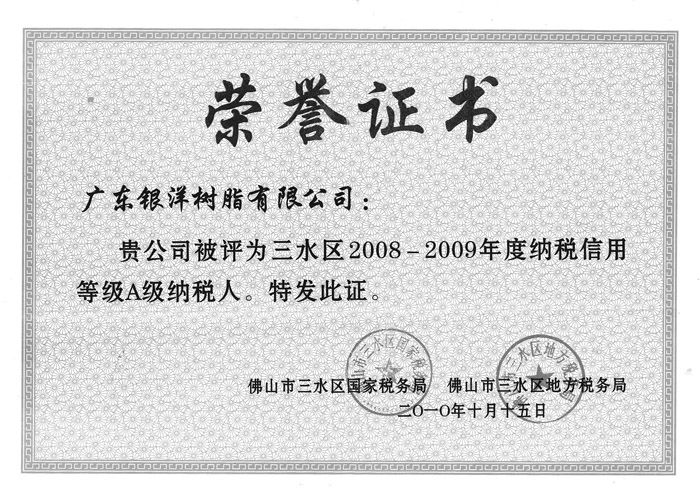三水區(qū)2008-2009年度納稅信用等級A級納稅人